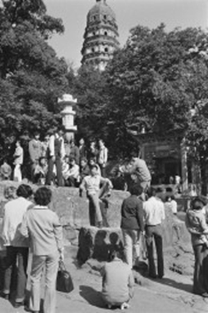 苏州 Suzhou 名胜虎丘塔前,游客争相留影。