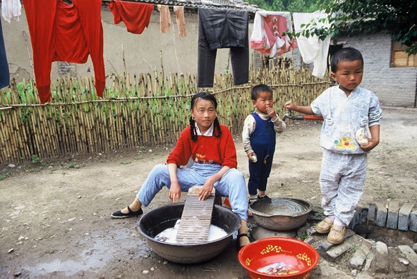 山西五台山 Wutai Mountain, Shanx 在自家后院洗衣物的姐姐,还需要照顾弟弟。