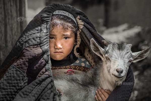 小女孩怀抱心爱的羊宝宝在家门口晒太阳,眼里流露着清澈渴望的目光。