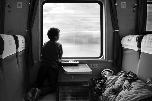 普通列车上,跟随家人进城打工的孩子安静地看着窗外很久很久。