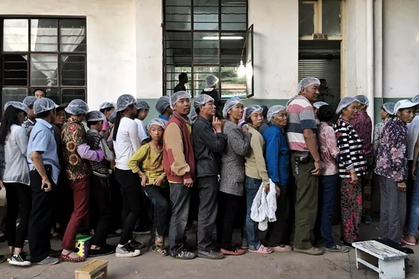在一个偏远山区小县城的手工作坊里,各个年龄阶层的村民排队等待领取手工。
