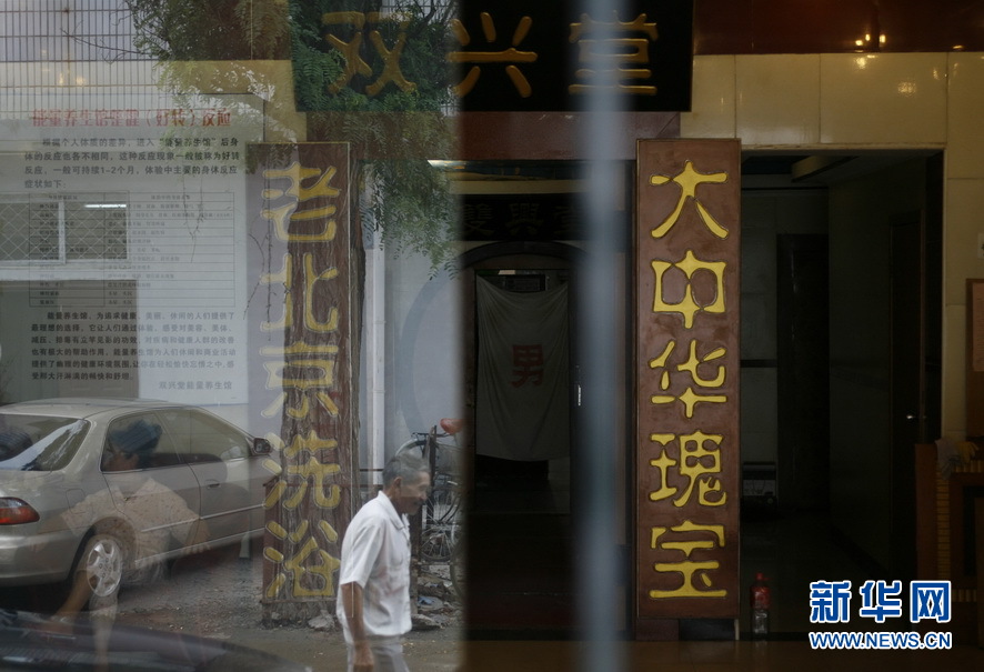 1998年张扬电影《洗澡》便在这里实景拍摄,而该部电影的剧照,也悬挂在墙壁上,成了浴池的活招牌。2004年喜欢北京老澡堂子文化的熊志忠接收了这家老澡堂子,按照老澡友建议重新修建了老式泡澡池,捅开了盖住澡堂子休息大厅正中的PVC板,澡堂子正中的中式天窗又露了出来,6米高的挑空敞亮又透气。一池清水、24个厢座,澡客赤裸相见,没有高低贵贱之分,一起侃大山、下象棋、喝茶抽烟、搓澡、修脚、拔火罐。新华网发(王申 摄)