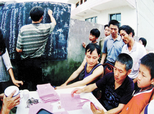 选举村委会 徐昌平/摄(浙江省富阳市渌渚镇岘口村选举村委会主任,唱票阶段,竞选双方目不转睛地关注着唱票人员手中的选票。)