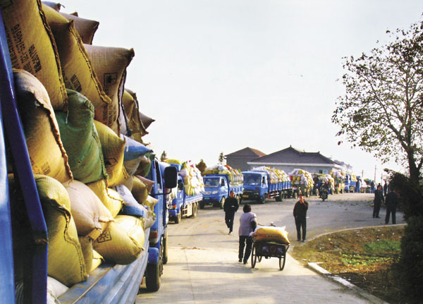 售粮长龙 钱勇赴/摄(上海市松江区泖港镇,预约稻谷烘干的车队排起了长龙。)
