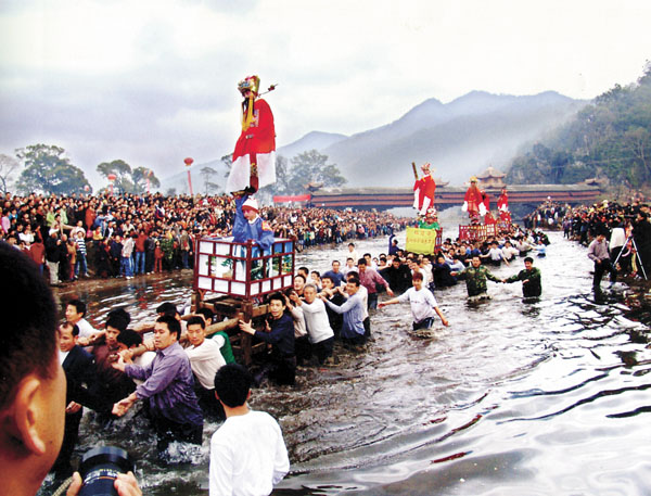 客家民俗“走古事” 石勇/摄(福建省武平县中堡镇朱坊村,客家民俗“走古事”正式开始,人们勇往直前,谁先到达终点谁就赢,来年就会福气连连。)