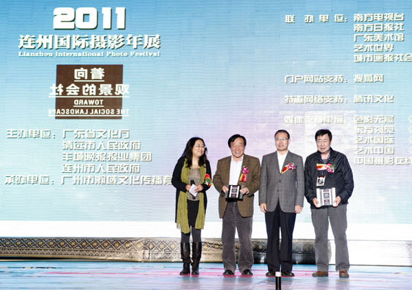 中国摄影杰出成就奖朱宪民(左二)、王玉文(右一)上台领奖。