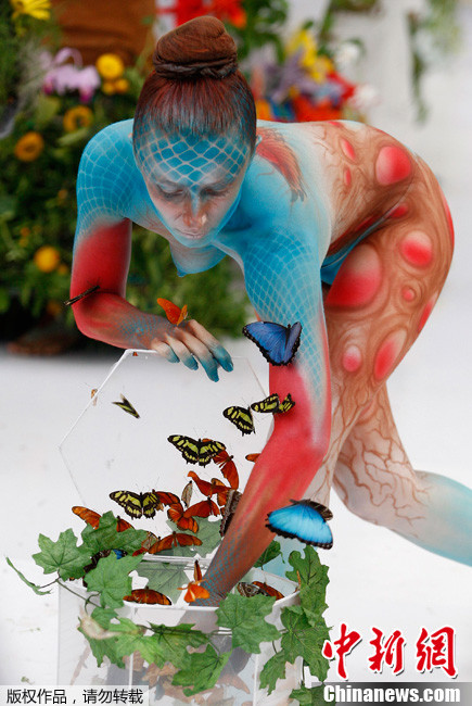 11月26日,一场生态时装秀在哥伦比亚的卡利市举行,展出的所有服装都是用天然材料和活植物制作的。图为一名彩绘模特在表演。