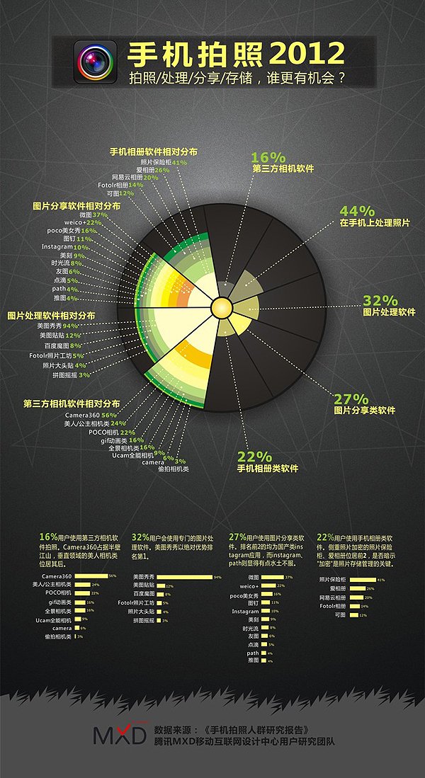 据悉,腾讯移动互联网设计中心此次调查中,其覆盖了一万名左右的iPhone、android手机拍照用户,针对手机拍照、处理、分享、存储等四类应用做了全面的数据分析。