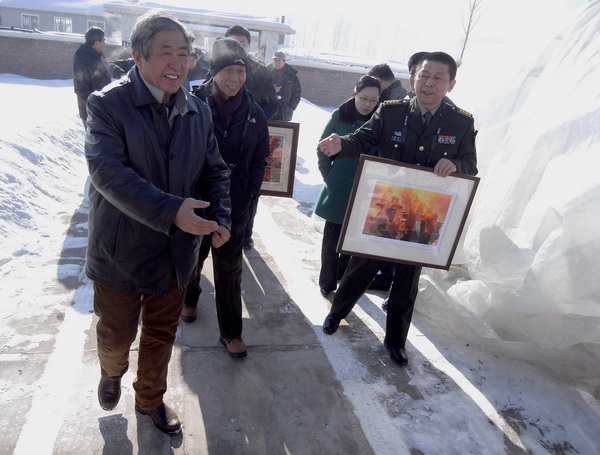 鸡冠山乡地处铁岭市东部偏远山区,当天雪花飘舞,气温零下25度。由省文联党组成员、副主席伊忱带队,摄协主席刘志超,副主席、秘书长鲁文等一行15人来到大雪覆盖的铁岭县鸡冠山乡岱海寨村,为这里村民带来了他们每人精心准备的一幅幅装裱精美的摄影作品及年画等慰问品。摄影家们冒着严寒不顾旅途疲劳,下车就分别走进杨玉庭等五户军属及低保家庭。他们一边送慰问品一边与老乡合影留念并同他们亲切交流。老乡们笑逐颜开忙里忙外,就像过年一样接待远方来的客人。山里风很冷,但这里气氛很温暖。