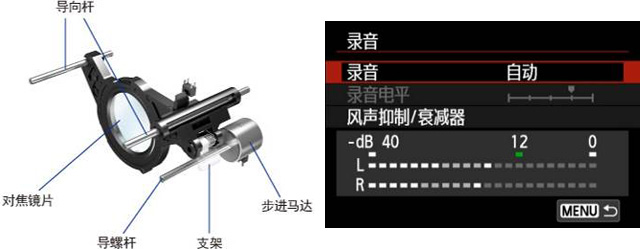 左:EF-S 18-55mm f/3.5-5.6 IS STM搭载的STM+导螺杆型单元,右:通过录音功能可进一步抑制短片拍摄时的噪音