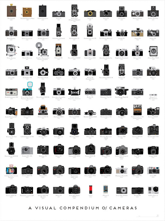如果要细数历史上最重要的100款相机,相信都很难有个完美的答案吧?来自Pop Chart Lab设计的海报,列举了自1888年柯达第一台相机诞生起,到2013年100款具有历史意义的相机,看看里面有没有你心目中的选择?