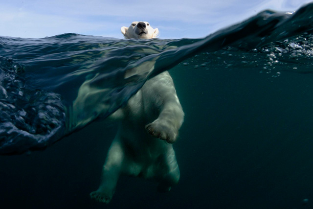 在拍摄这张照片时,摄影师距离这头白熊仅有数英尺远(1英尺=0.31米)。要知道,北极熊是一种会主动攻击人类的熊,而且是游泳健将,在水中动作非常灵活,摄影师能够在它面前全身而退是非常幸运的。