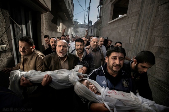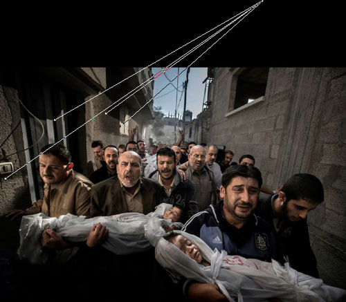 这张受到指控的照片是由作者Paul Hansen于去年11月20号,在加沙的一场葬礼上拍下的,照片中的人们正在为巴以火箭弹互相袭击中遇难的两个儿童送葬——当然,这个事件本身并非虚构,但是我们最后看到的照片,是由多张合成的。
