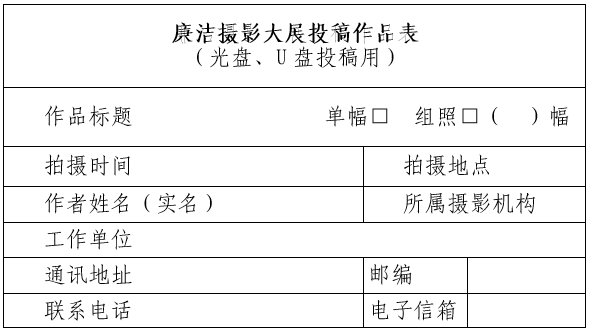 投稿作品以光盘(CD-R或DVD-R)、U盘存储形式邮寄至:北京市东城区东四十二条48号 中国摄影报社活动项目部“廉洁摄影大展”办公室收(100007)