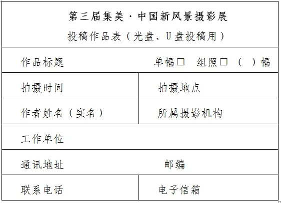 投稿作品以光盘(CD-R或DVD-R)、U盘存储形式邮寄至:北京市东城区东四十二条48号 中国摄影报社活动项目部“第三届集美·中国新风景摄影展”办公室收(100007)投稿热线:010-65251661。