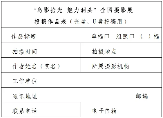 投稿作品以光盘(CD-R或DVD-R)、U盘存储形式邮寄至:北京市东城区东四十二条48号 中国摄影报社活动项目部“洞头全国摄影展”办公室收(100007)投稿热线:010-65251661。