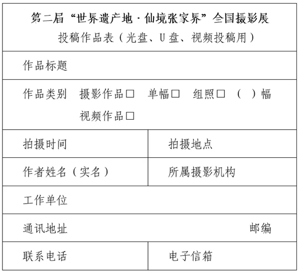 官方网站:作者可在诠摄汇网“参展”专区(dz.cppfoto.com)“第二届张家界全国摄影展”中注册,并按要求填写真实个人信息后上传作品。主办单位保证不公开或泄露投稿个人非公开信息。投稿作品为JPG格式,图片统一处理为长边1000-1500像素,文件大小控制在500KB-1MB以内。