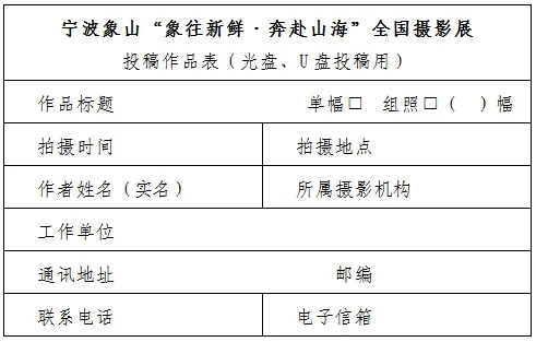 投稿作品以光盘(CD-R或DVD-R)、U盘存储形式邮寄至:北京市东城区东四十二条48号 中国摄影报社活动项目部“象山全国摄影展”办公室(100007)