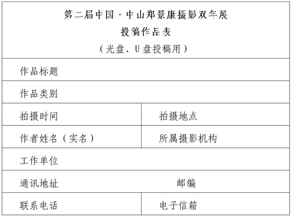 投稿作品以光盘(CD-R或DVD-R)、U盘存储形式邮寄至:北京市东城区东四十二条48号 中国摄影报社活动项目部“第二届中国·中山郑景康摄影双年展”办公室(100007)投稿热线:010—65251661。