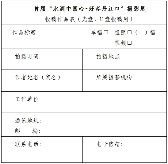 投稿作品以光盘(CD-R或DVD-R)、U盘存储形式邮寄至:北京市东城区东四十二条48号 中国摄影报社活动项目部“首届丹江口摄影展”办公室(100007)