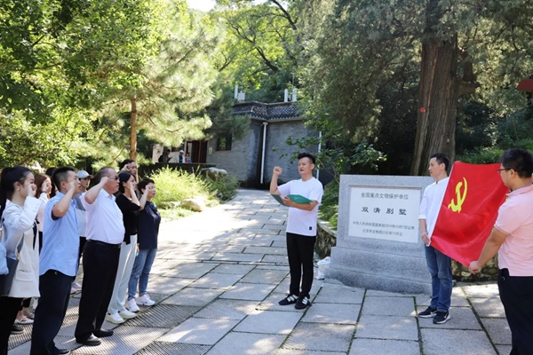 随后,大家前往双清别墅进行参观学习。参观前,全体党员同志在双清别墅革命纪念基地前,重温了入党誓词,再次立下了自己的铮铮誓言。双清别墅是1949年3月到8月,毛泽东等老一辈无产阶级革命家率中共中央、解放军总部从河北平山县西柏坡迁至北平时居住和工作的地方,曾是中共中央的指挥中心。这段期间正值解放战争行将胜利、新中国即将诞生的历史转折之际,毛泽东与中央其他领导同志在此共商大计,指挥了渡江战役,筹备了新政协会议的召开,更写下了《南京政府向何处去》、《人民解放军占领南京》等著名文章和诗词,书写了中国革命史上最灿烂的篇章。