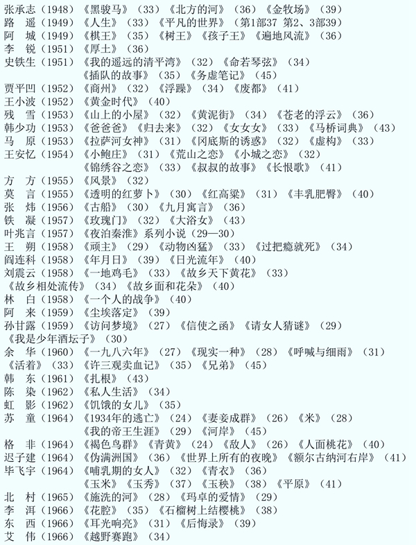 何平统计的新时期以来部分知名作家发表代表作时年龄表(注:姓名后数字为出生年份 作品后数字为该作品的首发时作者的年龄)