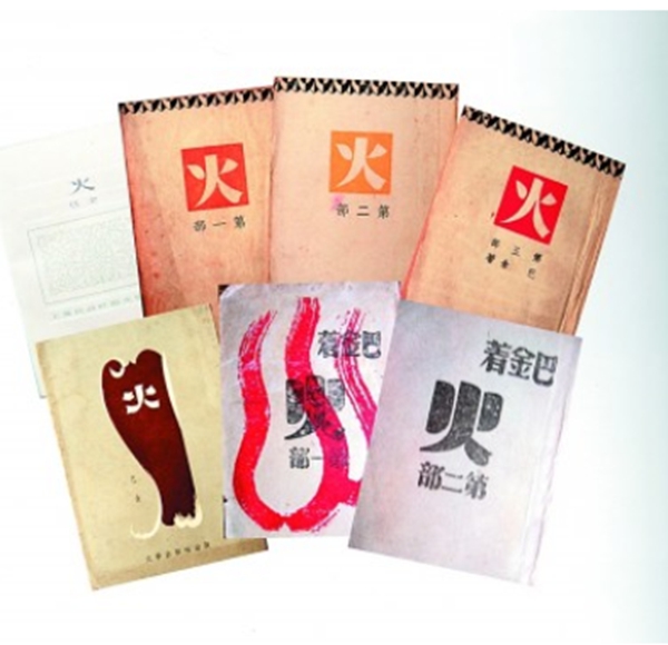 和众多作家一样,巴金最重要的武器是手中的笔,抗战时期他完成了长篇小说《火》。该书分三部,仅从《火》第一部就能够看出巴金是在怎样的环境下写作的:1938年5月广州,在敌机的不断轰炸中,巴金写下小说前三章,后来因敌机连续的大轰炸而中断写作。当年9月,他从汉口回到广州,续写了第四章,不久日军从大亚湾登陆向广州进发,巴金和朋友们离开广州。12月在桂林的大火中,巴金续写小说。1940年7月,蛰居“孤岛”上海的他,开始接着写,却又因租界里敌人的大搜查中断。后来,到了昆明,他才终于完成写作……从《火》最初出版到晚年重印,他对这部作品都不满意,认为在艺术上这是一部“失败之作”。然而,他又从未后悔写了这样一部作品,他认为,写这小说,为的是发散热情,宣泄悲愤,鼓舞勇气,巩固信仰,找寻未来中国的希望,“老实说,我想写一本宣传的东西”。(《〈火〉第一部后记》)在他看来,这是尽一位作家的责任,尽一位中国人的责任,在民族危亡之际,对此,谁都责无旁贷。
