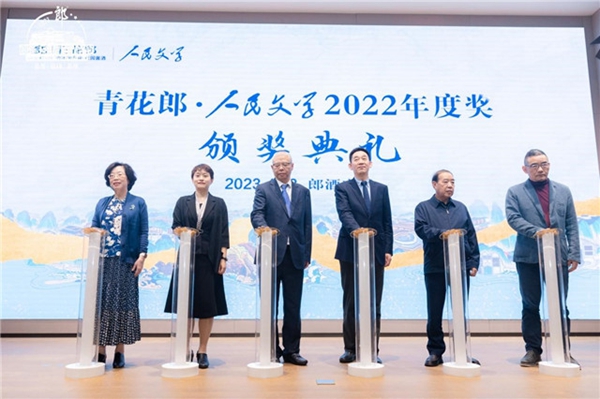 4月13日上午,2022年度青花郎 · 人民文学奖颁奖典礼在四川古蔺郎酒庄园举行。中国作家协会党组成员、书记处书记、《人民文学》杂志社主编施战军,郎酒股份总经理付饶,泸州市委常委、宣传部部长徐利,四川省作协副主席罗伟章出席典礼并致辞。郎酒集团党委书记李明政,《人民文学》杂志社副主编徐则臣、陈涛,泸州市委宣传部常务副部长贾如彬,诗人舒婷、作家苏童、评论家陈仲义,本届评审委员会评委张陵、王干、刘琼、张莉、程旸,古蔺县委常委、宣传部部长葛鹏程等参加活动并为获奖者颁奖。