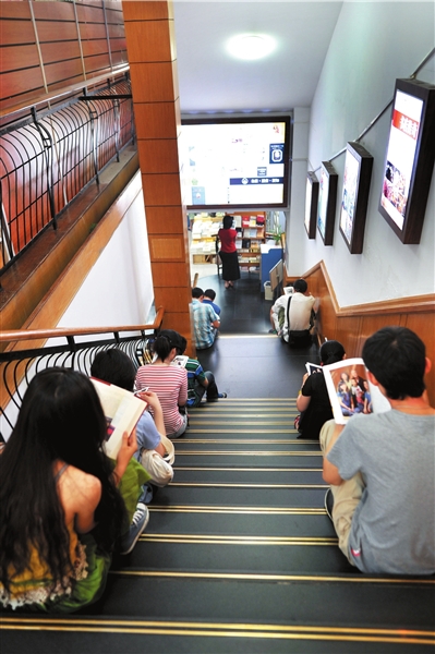 2012年7月1日,读者们坐在三联书店通往地下一层的楼梯上看书,这是三联书店最具代表性的画面。 图/CFP