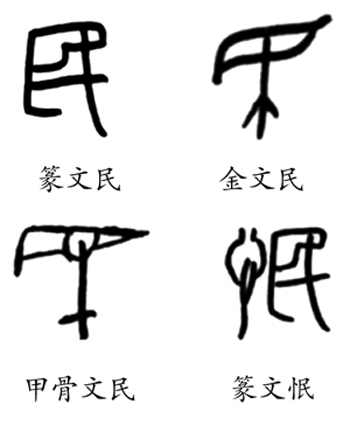 民字象形,锐器刺目使瞎,应该是最早的盲字。从目亡声的盲,甲骨文和金文都没有,当然是晚造字。早期造出来专指眼睛瞎,只有这象形的民字,音义皆等同形声的盲字。也就是说,民即盲也。远古歧视战俘,语言侮辱,贱呼为民(骂人家瞎了眼)。战俘拿来做了奴隶,仍称为民。卜辞有“卯民”的记载,与“卯牛”和“卯羊”一样,把奴隶当牲口杀了祭祖。后来民的称呼扩大范围,凡被统治者都可称为民,字或作氓。篆文民字变形,必须细心慢审,方能看清楚锐器刺目之迹象。从瞎眼的民,到民主的民,古今多少辛酸泪。