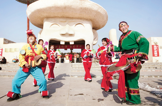 一支民间花鼓队在万荣县笑话博览园门前为游客表演花鼓