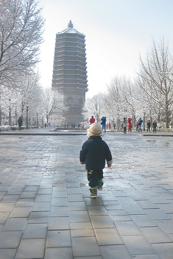 贞观是勇敢的,他一个人正朝那无声无光的石塔走去。(贞观是张晖两岁的儿子,图文来自张晖夫人张霖微博)