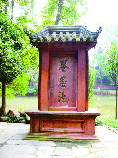 罨画池是全国重点文物保护单位,崇州友人告诉我,罨画池能成为天下名园,是因为园内外“三位一体”的古建筑,除了罨画池的唐宋园林,还有园中的陆游祠和与此毗邻的文庙。陆游祠是后人为纪念陆游而建,建筑虽古,祠中陈列的诗词书画,却是现代人对陆游的解读和敬意。文庙是传统的孔庙,始建于明代,重修于清代,陆游住在这里时,还没有它的踪影。不过崇州文庙却是极为稀罕的古建筑,高大的木结构牌楼斗拱,造型繁复精美,其中,竟然没有一根铁钉,全用木榫连接,堪称奇观。在罨画池转了一圈,留在我心中最深的印痕,还是陆放翁的诗迹,他的诗歌意境,复活在生机不衰的古老园林中。