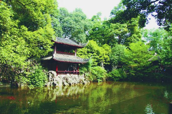 罨画池被烟雨笼罩着。坐在湖畔的亭榭中喝茶,聊天,看风景。湖上天色奇异,密布的云团,竟然没有将阳光全部阻隔,几缕阳光从云隙中射出,融化在迷蒙的烟雨中,湖面闪动着斑斓的光点。湖上有雾,雾气若有若无,在水面漂浮,远远近近的树、桥、亭台楼阁,都变得如同印象派油画中的景物,朦胧而神秘。湖畔的垂柳在雨雾中轻摇,那一缕缕飘扬的翠绿,给人亲切的感觉,如有人晃动丝绸的衣袖,试图拂去湖上的雾气,还天地以清明。