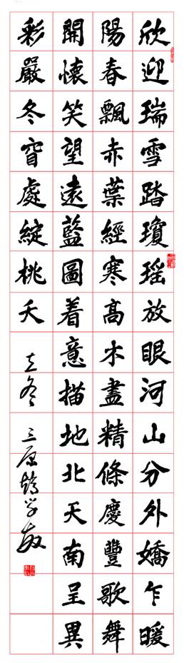 赵学敏先生《立冬》一诗,着眼于立冬节气大自然的宏观表现,通过对初冬壮观的雪景,落叶的树木,广大群众庆丰收欢乐场面的描写,用简短鲜活的语言勾画出了祖国大好河山波澜壮阔的气象,虽是描写几个物候的景象,但使人领悟到了气势磅礴的祖国山川;虽是初冬寒来万木落叶,但丝毫没有凄凉寒冷,却是庆祝丰收、再绘蓝图的热烈劲头,整首诗从头到尾贯穿了作者的家国情怀,渗透着对祖山河深深的爱恋。首句“欣迎瑞雪踏琼瑶,放眼河山分外娇”,通过观赏踏步雪景,一下子把人引入了初冬节气的氛围,身临其境,倍感心旷神怡。三、四两句 “乍暖阳春飘赤叶,经寒高木尽精条”和 “庆丰歌舞开怀笑,望远蓝图着意描”,是两个对仗句,工整珠联,在意境上形成鲜明对照。“赤叶”、“精条”把立冬万木落叶描写得贴切真实,“庆丰”、“望远”把广大群众既庆贺总结丰收成果,又着意规划来年生产计划突现出来。《立冬》这首诗是写立冬节气特点,而内涵却是写人民群众,表达了对人民群众生产、生活实践的歌颂。读到这里,读者不由自主地想到习近平主席高屋建瓴规划设计“一路一带”战略,为世界经济和我国经济发展描绘宏伟蓝图,真是立足人民、高瞻远瞩的博大胸怀!尾句“地北天南呈异彩,严冬窅处绽桃夭”,进一步描写祖国山河的多彩多姿,预示了冬天到了,绚丽勃发的春天不会远了!