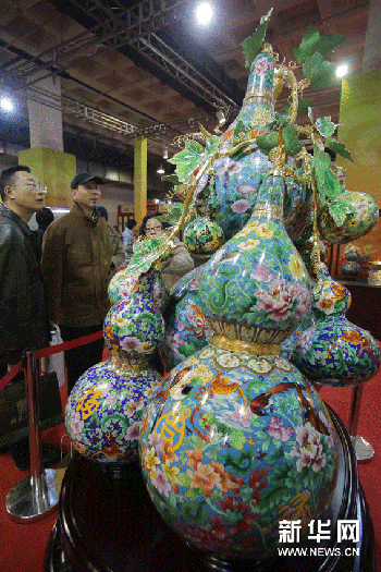 12月20日,在第七届中国北京国际文化创意产业博览会上,观众在欣赏景泰蓝作品《福禄万代》。