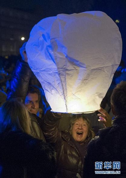 新年前夕,克罗地亚民众在首都萨格勒布艺术广场放飞“孔明灯”,表达新年祝愿。