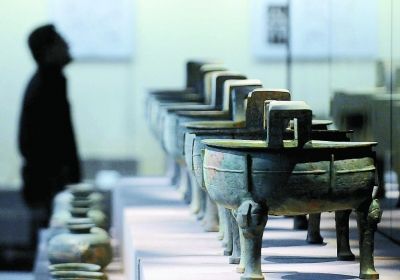 4月7日,“国王与诸侯——中国河南青铜文明展”在河南省洛阳市洛阳博物馆开展。本次展览展出了河南省出土的夏、商、周时期117件(组)珍贵青铜器,多数为近年来的考古新发现。图为一名观众在欣赏一组东周时期的青铜礼器。
