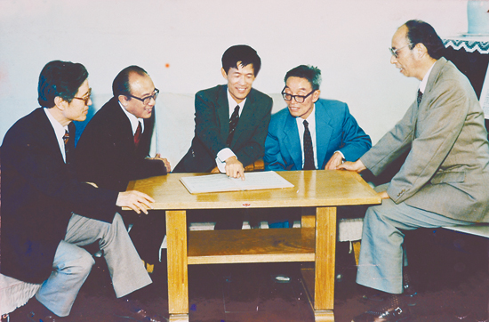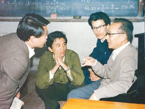 作曲系学科教师王宗鉴、张守明、薛金炎、于行、刘学严在进行研究(1988年)