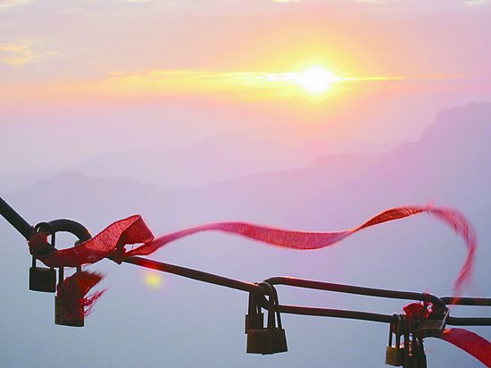 从较低的北峰,一直登上擦耳崖、苍龙岭、金锁关、东峰、南峰、西峰,一路走来,多了两样色彩,黄色和红色。黄色是锁,红色是絮。谓之金锁、长命锁、同心锁。锁上拴一缕红布花絮,飘逸醒目。重重叠叠,一摞一摞,如胶似漆,紧锁在沿途的护栏石柱上,铁链上。越是高拔险峻的地方,金锁越多。常常的,会出现一个画面。高高的花岗岩石上,没有一棵树,没有一株草,只有一长溜艳丽的红黄铁锁,侠士一般,傲立峰顶,构成了华山一道新的景观。