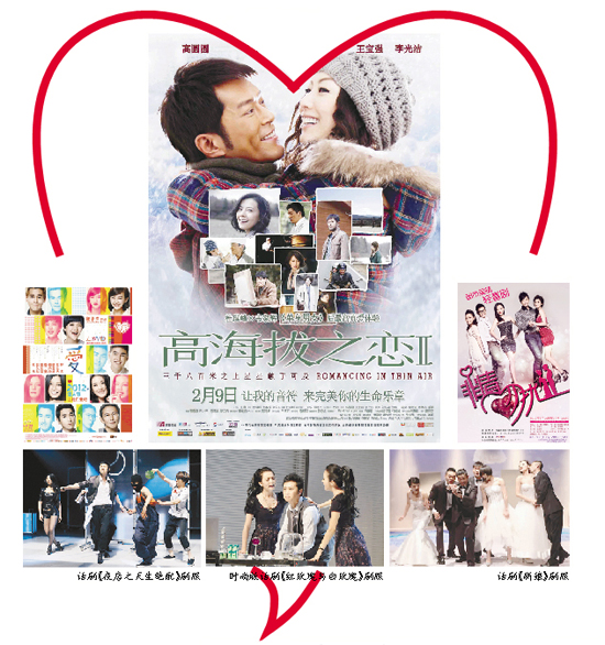 或许是2011年的“光棍节”,一部《失恋33天》的意外“杀出”令不少人始料未及。所以今年的情人节仿佛备受关注。先说说电影,今年的情人节档共有5部爱情片公映,包括《高海拔之恋Ⅱ》《我愿意》《LOVE》《豪门生死恋》《真心话大冒险》。此外,还有原定上映的《嫁个一百分男人》《乌龙戏凤2012》《女人如花》和《初恋时光》这4部电影“知难而退”逃离情人节档期改期上映。即便如此,今年的情人节档期依然“爆挤”,就目前国内市场容量而言,一周内最多能容纳2到3部影片大卖,像这样仅情人节一天就有三部爱情片集中上映,再加上《碟中谍4》仍有很高热度且还未下映,前后夹击的情况下,只为应景的争夺“情人节”这一天,那么多数影片成为炮灰已是必然。相比起2010年“情人节档”的《全城热恋》以及2011年的《将爱情进行到底》,今年情人节档的影片给人感觉重点不突出,不仅观众选择起来比较困难,对于影院来说也是一场“灾难”,排片成为他们最头疼的事。几部影片同时上映,在宣传和影片质量上基本差不多,场次有限,的确左右为难。业内人士指出今年应景的爱情片虽多,却并没有一部营销做得人尽皆知,甚至有的影片连影院的从业人员都不知道讲的什么,难以向观众推荐,而作为普通观众就更不知所以了。