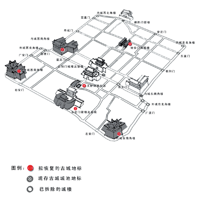 据悉,北京市政府及东、西城政府将组织实施历史文化名城标志性景观的恢复,继续按照“完善两线景观、展现皇城格局、维护古都风貌、保护京郊史迹、整治文物环境、实现合理利用”的总体设想,保持明、清北京城“凸”字形城郭平面,保护好以现状护城河为标志的外城轮廓及城墙走向,进一步保护和恢复北京古都的整体形象和传统城市结构,力争启动明北京城城墙遗迹、永定门瓮城及箭楼、北京内城西南角楼、左安门角楼、右安门角楼等重要节点景观修复工程,形成内、外城的整体景观。