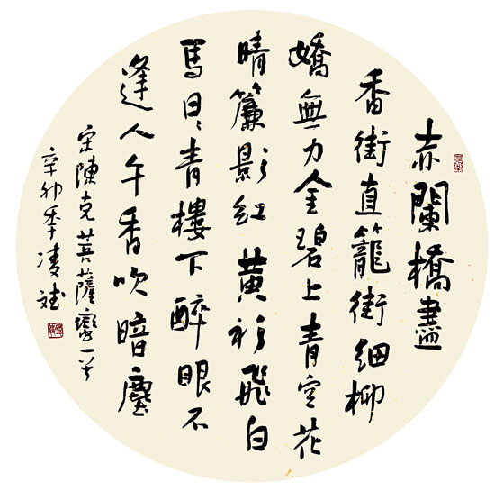 我以为凌斌书法之所以给大家带来惊喜,主要表现在3个方面:第一,出手不凡。从他的作品中你不难找到秦汉遗韵、大汉风骨,更能感受到时代气息和青春律动。用笔古拙,结体悠闲,通篇无滞留和轻浮之气,在轻松明快的线条中使你仿佛游走于历史与当代之间。似曾相识,又如隔世。这不能不说是他带给我们的不俗的艺术享受。这也就给他的作品确定了一个脱俗的雅的品格。我想,一个艺术家有了这种品格就犹如迈上了艺术殿堂,多重宝藏你可尽收囊中。第二,落笔不俗。从凌斌的作品中你能感觉到一种清雅之气。他并不想急于表现什么,而是慢慢写来,不慌不忙,沉着而又洒脱,在这种轻松的氛围中使你进入了他的书法世界。这种看似容易的情境其实是长期积累和提炼的结果,表现出书者的艺术理念和艺术追求,不是所有的书法家想到就可以做到的,这其实是一种格调、一种境界。多年来,只要是别人的长处他都会记在心里,对别人的意见和建议他都认真改进。日积月累,久而久之,人们发现凌斌的变化:他的人沉稳了,他的字有味道了。第三,与众不同。“能于同处求不同,惟能不同斯大雄。”这是林散之先生的论书诗句。这说明书法艺术个性的极端重要,要于同处求不同。凌斌深得其中三昧。他从汉碑中走来,一路风餐露宿,一路朝花夕拾。虽然满目珍宝,但他明白师古而不能泥古,不能面面俱到,只能抓住一点,钻进去、拿到手。他懂得学习传统是根基,但一定有自己的理解,一定要有自己的追求,所以他从古走到今,又从今回到古。在来来回回的追寻中他找到了自己,逐步形成了自己的艺术风格。现在我们从凌斌的作品中既能找到前人的影子,又能看到当代的印迹,但更多的是看到了他的艺术个性。这很重要,也很难得。