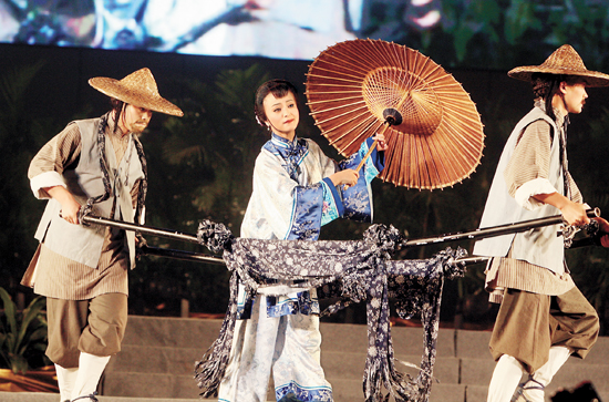 甬剧《典妻》利用轿夫的舞蹈动作大大地强化了那位心牵两个孩子的母亲复杂情感的表达,体现了“新程式”的特点。 新华社发 尚洪涛 摄