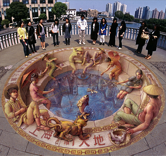 安安稳稳的站在平地上也会感到心惊胆战,你相信吗?走近3D街画艺术家的作品,完成一次与作品的亲密接触,你就会相信,这的的确确是真的。明明是平坦的地面,在艺术家的笔下竟能变成奇幻的三维世界。这不仅需要高超的画技,更需要精确的计算,强大的想象力和深厚的艺术修养。仅有30年发展历史的3D街画艺术界世界知名画家并不多,本文将向读者介绍几位艺术家及其作品,希望能给读者视觉上的震撼和享受。