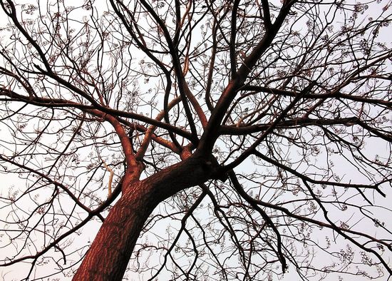 寒假在家,晚上我一人先回家时,总是看看梧桐树,冬日的夜里,孤冷分明的黛色天空下,光秃秃的枝干上是光秃秃的枝桠。仰望,枝桠蜿蜒伸展着,如同伞的骨架,但上下错落,东西各向,无规律可循。我总是想,梧桐在冬眠。