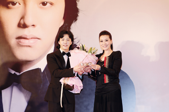 青年歌唱家谭晶亲临发布会现场祝贺,并为李云迪送上水晶钢琴。