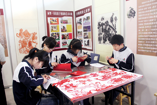 剪纸展示区里,潍坊市潍城区望留中学的几位学生正在有模有样地进行“创作”,虽然周围人声嘈杂,但小艺术家却没有受到丝毫干扰。虽然年纪只有十三四岁左右,但一张张小小的红纸在他们的手中就像变戏法一样,逐渐变得内容丰富、生动,充满趣味,虽然作品还稍显稚嫩,但他们举手投足之间却很显专业范儿,可见有名师指点,并且下了很大功夫。据了解,剪纸课程贯穿该校的初中教育,剪纸已经成为学校的一个品牌,对于孩子们来说已经融入到了他们的日常生活当中。