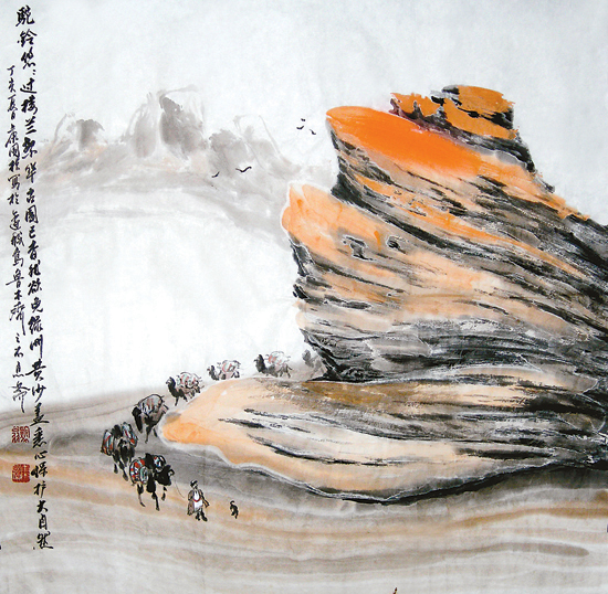 他画沙漠上的魔鬼城,画葡萄、哈密瓜,画梅兰竹菊,画小鸡……但最让他钟情的是“沙漠之王”——骆驼。骆驼,在最艰苦的环境里跋涉,不畏风沙、不怕干旱、不骄不躁、不卑不亢、宽厚仁善、泰然自若。骆驼是西北沙漠戈壁上最具代表性的亲人动物,是坚韧不拔的典型,是善良忠诚的代表。骆驼既具有绘画形体美学上的敦厚美,又具有最令人敬佩、感动的奉献精神。从这二者合成的意义上说,骆驼比狼、虎、马、牛、羊、毛驴等动物都要完美。