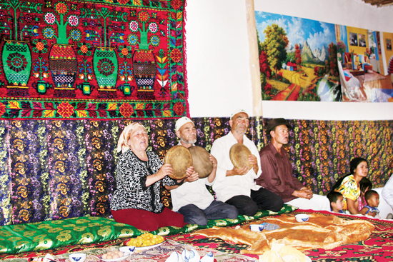图木舒克刀郎人在尽情演奏刀郎木卡姆。当地的习俗是只要父亲在,儿子只能够陪唱,直到父亲老了,老到唱不动那一天时,父亲才把全村子里和族人中的元老请来,对大家说,我已经老了,我从现在开始,让孩子唱了。大家就这样证明成规,也成为一种风俗,从此儿子才能登场。 张志学 摄